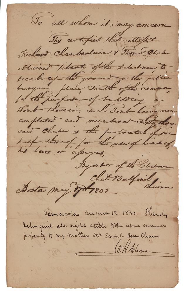 Early American architect (1763-1844) who designed numerous buildings in his native Boston and was principal architect of the US Capitol in Washington. ADS, signed “By order of the Selectman, Chas. Bulfinch, Chairman,” one page, 8 x 13.25, May 17, 1802. Handwritten document concerning the building of a tomb: "This certifies that Messrs. Richard Chamberlain and Thomas Chase obtained liberty of the selectmen to break ground in the public burying place, south of the common for the purpose of building a tomb therein; such tomb being now completed and numbered sixty-three. Said Chase is the proprietor of one-half thereof, for the use of himself, this heirs or assigns." Signed boldly at the conclusion by Charles Bulfinch. In fine condition, with tape repairs to the back of several fold splits.