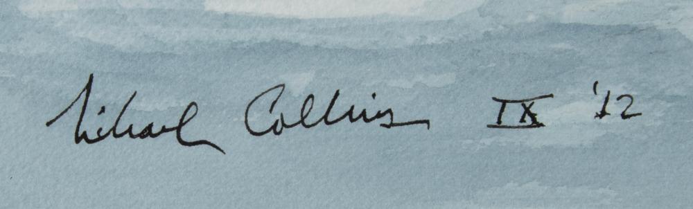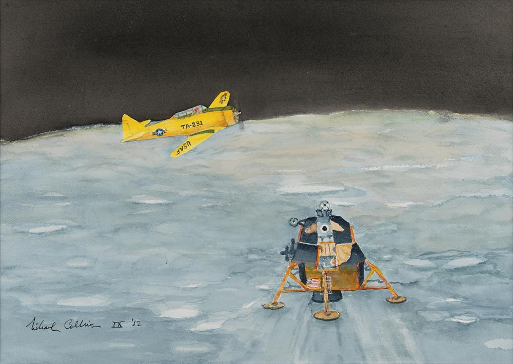 Wonderful original watercolor painting by Apollo astronaut Michael Collins entitled 'Flyby,' 18.5 x 13, which depicts a USAF jet flying over the moon and Lunar Module Eagle during the historic Apollo 11 mission, signed in black ink, "Michael Collins IX '12." Double-matted and framed to an overall size of 24.75 x 19.25. In very fine condition. Accompanied by a certificate of authenticity from Novaspace.