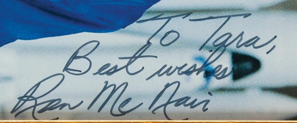 Color semi-glossy 7.25 x 9.25 photo of McNair posing in his blue flight suit, vertically signed and inscribed in black felt tip, "To Tara, Best wishes, Ron McNair.” Matted and framed with a pair of engraved information plaques, both relating to the Space Shuttle Challenger, to an overall size of 22 x 22. In fine condition.