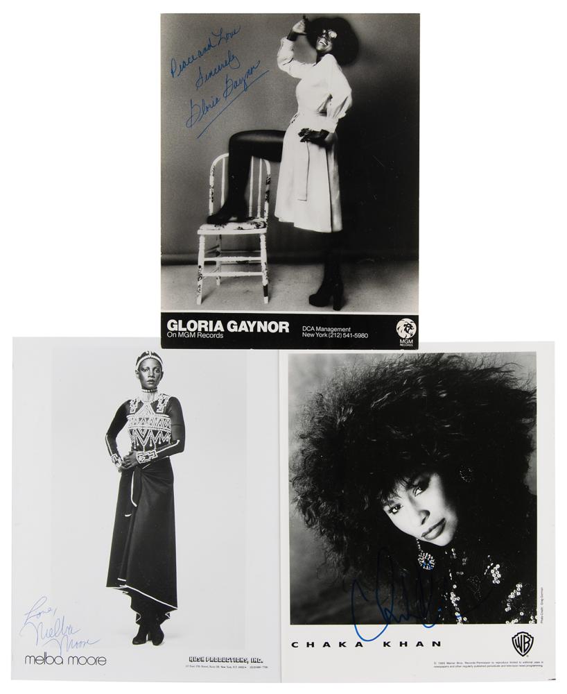 Three photos of popular disco singers, ranging in size from 7.5 x 9.5 to 8 x 10, each signed in ink by the subject. Includes: Gloria Gaynor, Melba Moore, and Chaka Khan. In overall fine condition.