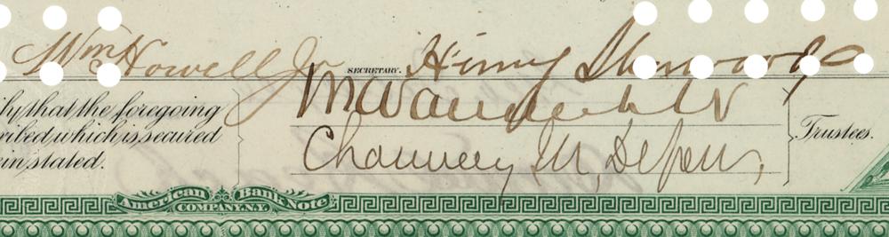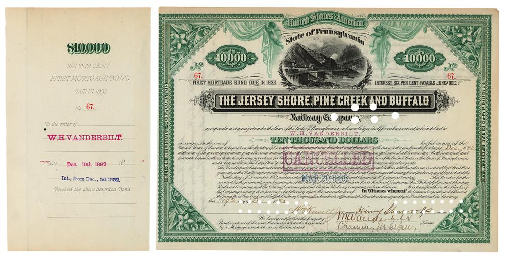 DS, signed “W. K. Vanderbilt,” one page, 12.5 x 9, December 19, 1882. First mortgage bond for $10,000 in the Jersey Shore, Pine Creek and Buffalo Railway Company issued to "W. H. Vanderbilt," signed at the conclusion by William Kissam Vanderbilt and Chauncey M. Depew as trustees. Also endorsed on the reverse by Cornelius Vanderbilt II and Frederick W. Vanderbilt. The receipt is detached but included. In fine condition.