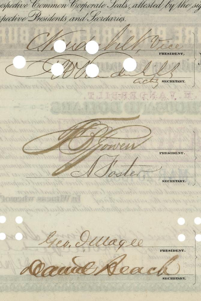 The Jersey Shore, Pine Creek and Buffalo Railway was a railroad built in the early 1880s to give the New York Central and Hudson River Railroad access to the coal regions around Clearfield, Pennsylvania. These significant signers include three sons of William Henry Vanderbilt: William (1849-1920) who managed his family's railroad empire and raced thoroughbred horses; Cornelius (1843-1899), a socialite, railroad executive, and philanthropist remembered for his Newport summer home, The Breakers; and Frederick (1856-1938) who was a director of the New York Central Railroad for 61 years. The other notable signer, Chauncey Depew (1834-1928), was long associated with the Vanderbilts, making his fortune as a lawyer and railroad executive before entering national politics.