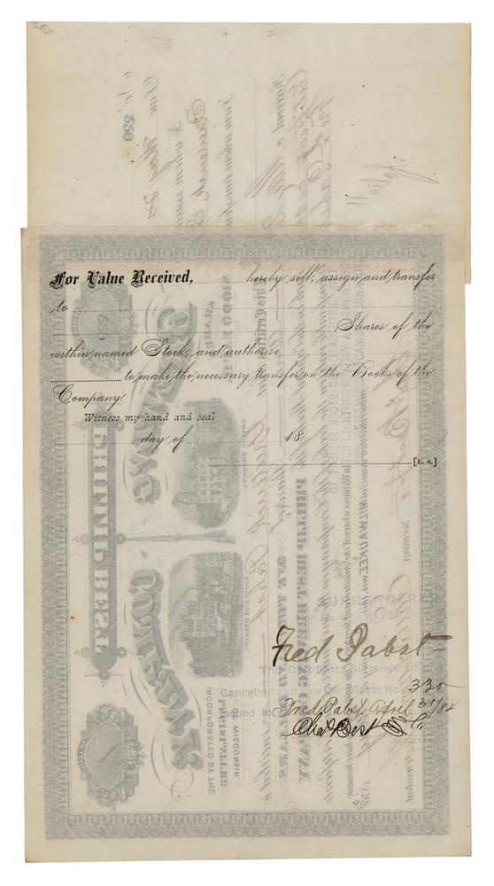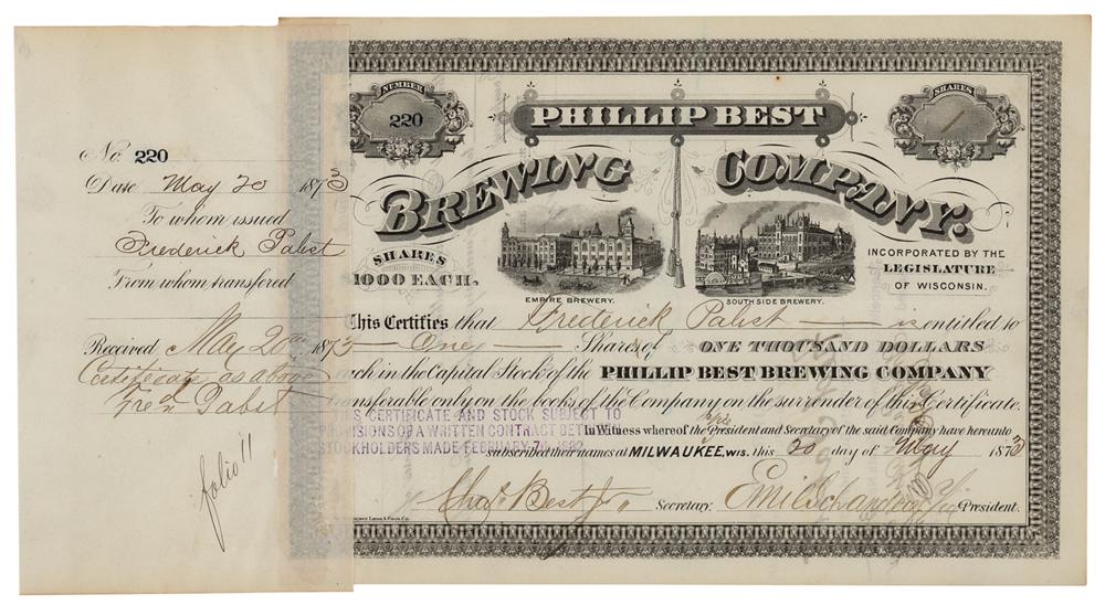 Brewer (1836-1904) who founded the company which, in the 1890s, introduced the 'Blue Ribbon' brand, the 'beer that made Milwaukee famous.' Significant partly-printed DS, signed twice, “Fred. Pabst,” one page, 10 x 7, May 20, 1873. Stock certificate for one share in the Phillip Best Brewing Company issued to Frederick Pabst, signed on the attached receipt and endorsed on the reverse by the 'Blue Ribbon' brewer. Also signed in ink by Emil Schandein as vice-president of the company and Charles Best, Jr., as secretary. In fine condition.