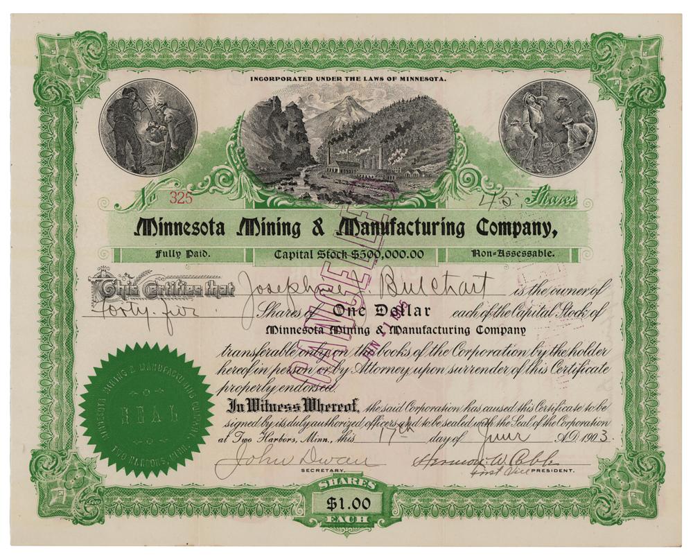Minnesota Mining & Manufacturing Company Stock Certificate Signed by Founders Cable and Dwan