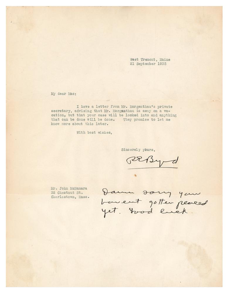 TLS signed “R. E. Byrd,” one page, 8.5 x 11, September 21, 1935. Letter to John McNamara, in full: "I have a letter from Mr. Morgenthau's private secretary, advising that Mr. Morgenthau is away on a vacation, but that your case will be looked into and anything that can be done will be done. They promise to let me know more about this later." He adds a handwritten postscript: "Damn sorry you haven't gotten placed yet. Good luck." In fine condition, with light show-through at the corners from old mounting residue on the back.