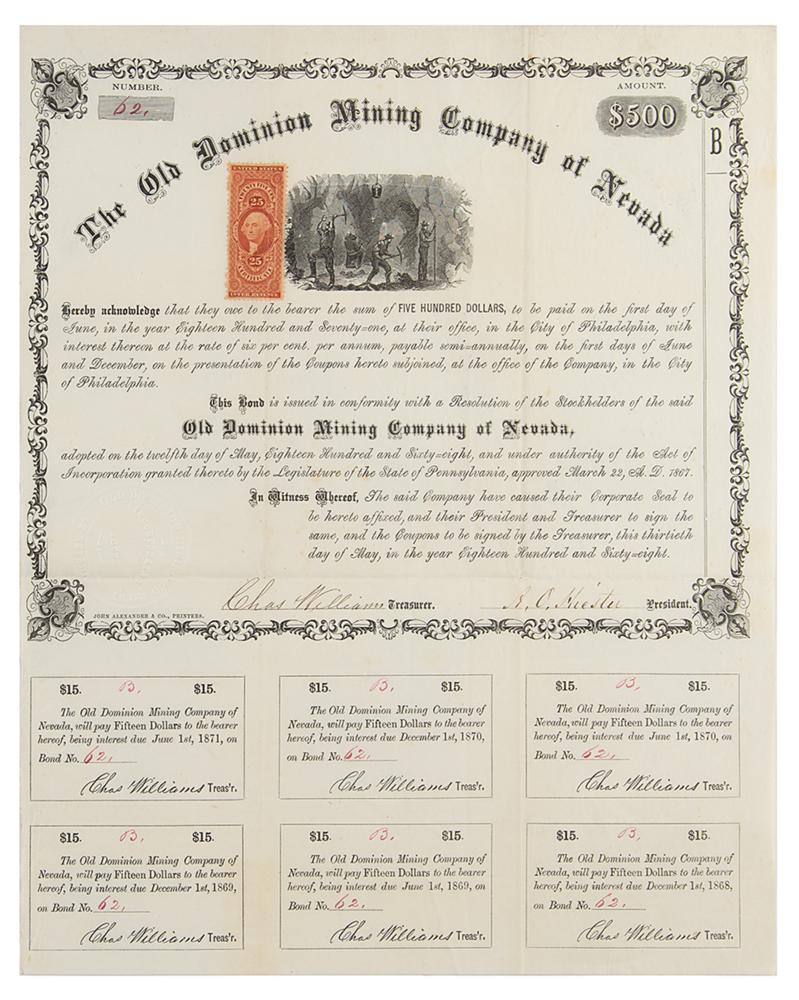 Attractive $500 bond of the Old Dominion Mining Company of Nevada issued May 30, 1868, 11 x 13.5, with six coupons intact below. The bond carries a rate of 6% and boasts a fine vignette of a classic mining scene. In fine condition.