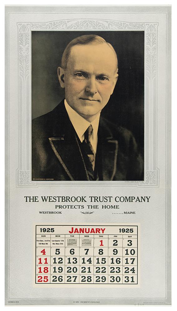 Oversized 15.5 x 28 salesman's sample of a calendar for January 1925, featuring a classic Underwood & Underwood portrait of President Calvin Coolidge. Printed for the Westbrook Trust Company by the Thos. D. Murphy Co., of Red Oak, Iowa. In fine condition.