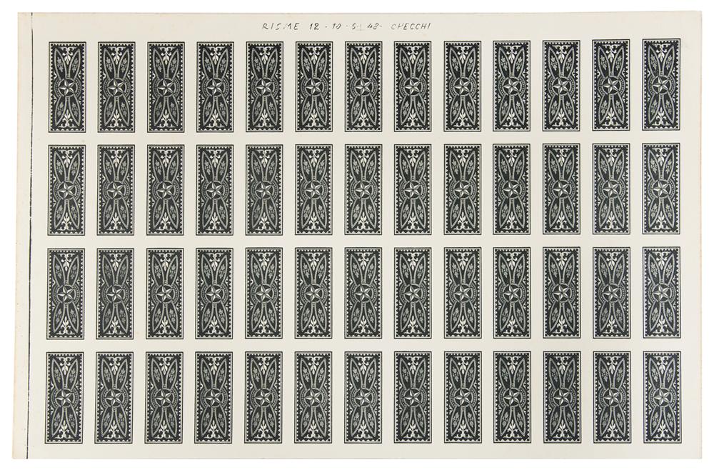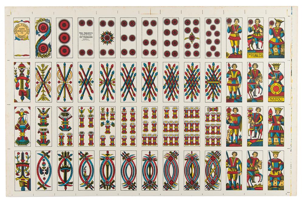 Colorful uncut sheet of playing cards in the Brescia pattern, 23.25 x 15, printed by Edoardo Pignalosa of Naples, Italy, circa 1940. In fine condition.