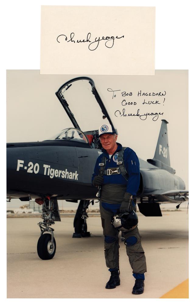 Two items: a color satin-finish 8 x 10 photo of Yeager posing in front of a Northrop F-20 Tigershark, signed and inscribed in black felt tip, "To Bob Hagedorn, Good Luck! Chuck Yeager"; and a felt tip signature, "Chuck Yeager," on an off-white 5 x 3 card. In overall fine condition, with two creases to the bottom of the photo.