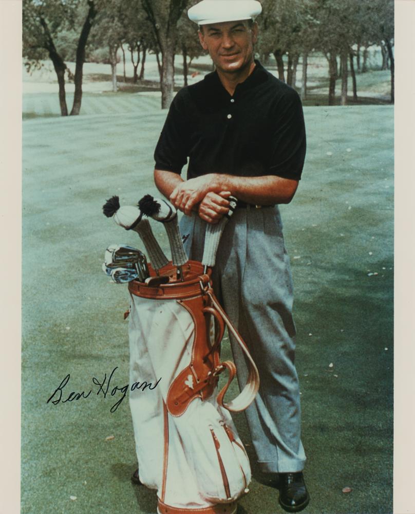 Color glossy 8 x 10 photo of Ben Hogan posing with his golf bag on the course, signed in thin black felt tip. In very fine condition.
