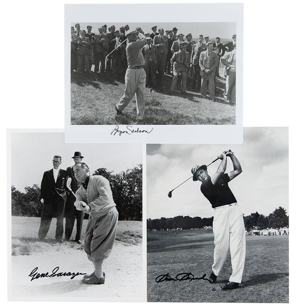 Three photos of classic golfers, 8 x 10 and 10 x 8, each signed in black felt tip by the subject. Includes: Sam Snead, Byron Nelson, and Gene Sarazen. In fine condition.