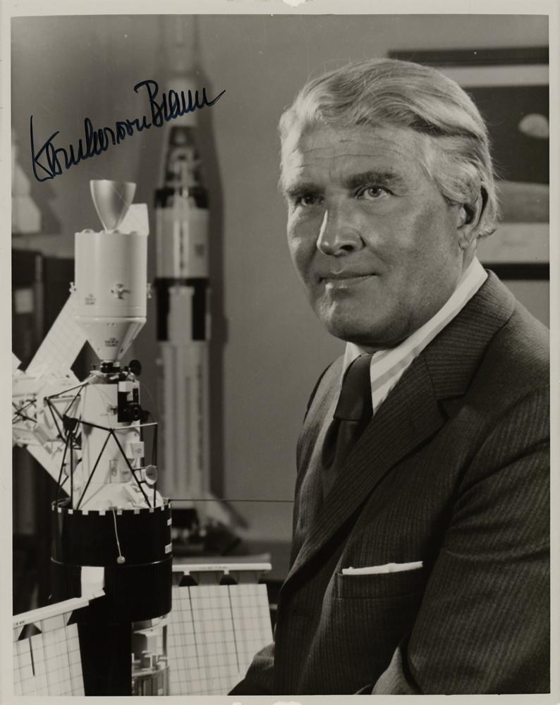 Fantastic glossy 8 x 10 photo of von Braun posing with a model of docked spacecraft, neatly signed in black felt tip, "Wernher von Braun." In fine condition, with a tiny area emulsion loss to the top border.