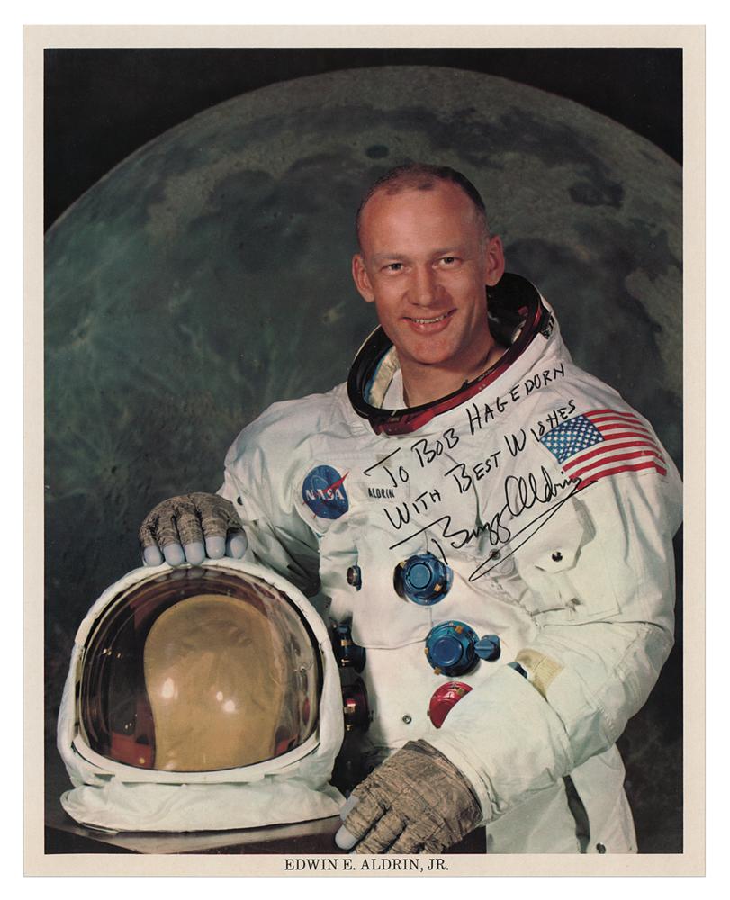 Official color 8 x 10 NASA lithograph of the Apollo 11 moonwalker in his white space suit, signed and inscribed in black felt tip, "To Bob Hagedorn, With Best Wishes, Buzz Aldrin.” In fine condition, with a small crease to the lower left corner tip.