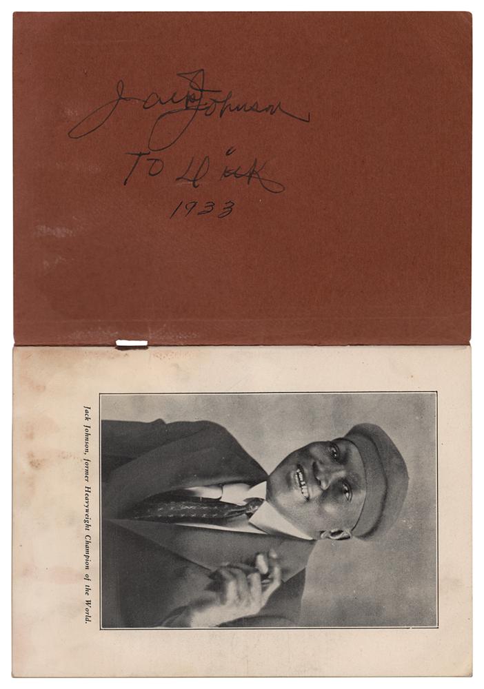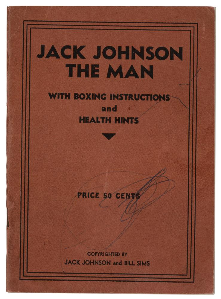 Scarce signed book: Jack Johnson, The Man, with Boxing Instructions and Health Hints. First printing with foreword by J. B. Lewis. Copyrighted by Jack Johnson and Bill Sims, 1932. Softcover, 5 x 6.75, 48 pages. Signed and inscribed vertically on the inside front cover in fountain pen, "Jack Johnson, To Dick," with another hand adding "1933." In fine condition, with a few childlike scribbles on the front cover and inside, not at all affecting the signature.