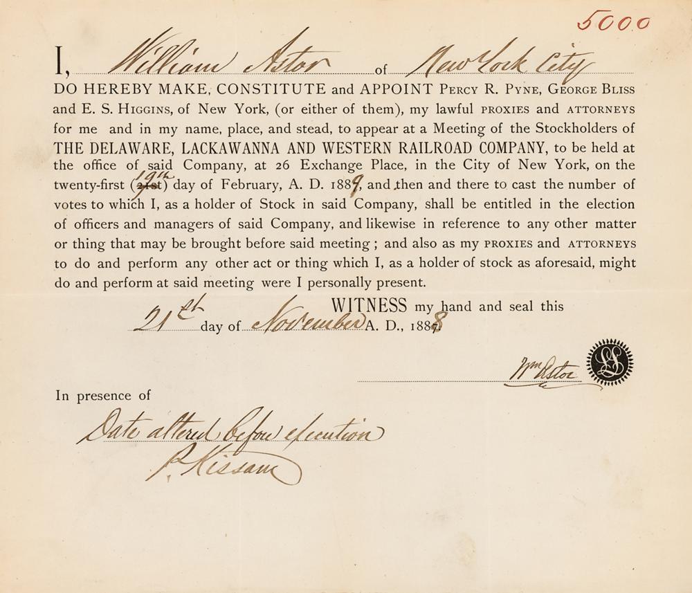 American-born statesman, philanthropist, and financier (1848-1919) of the prominent family of New York millionaires. Superb DS, signed “Wm. Astor,” one page, 8 x 6.75, November 21, 1888. Document by which Astor appoints "Percy R. Pyne, George Bliss and E. S. Higgins?my lawful proxies and attorneys for me and in my name, place, and stead, to appear at a Meeting of the Stockholders of The Delaware, Lackawanna and Western Railroad Company." Signed at the conclusion by Astor, and countersigned by Philip Kissam as a witness, noting: "Date altered before execution." In fine condition.