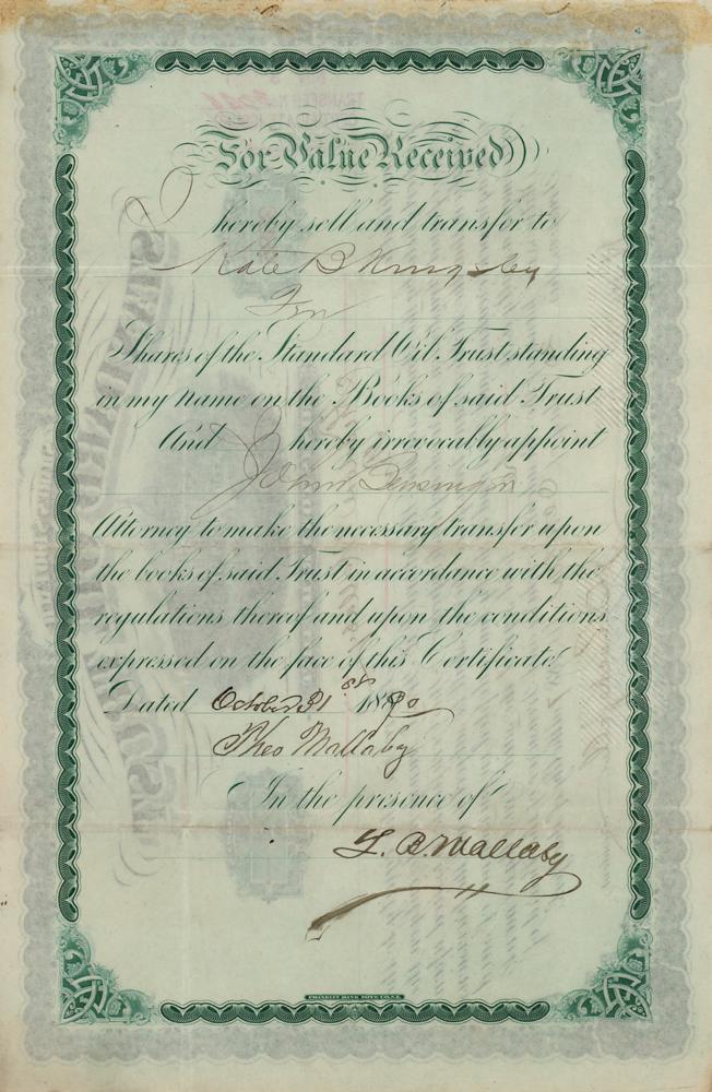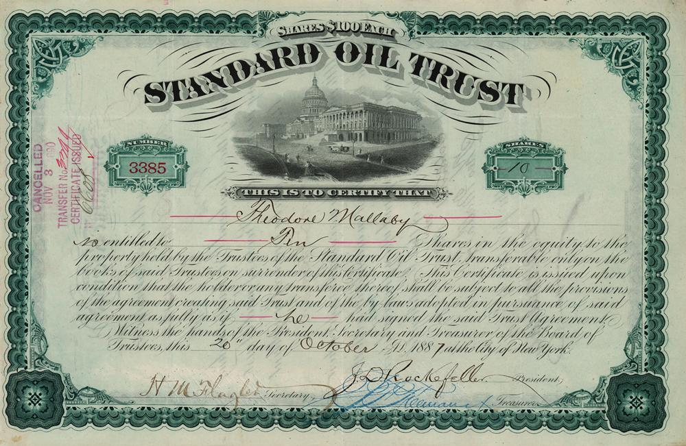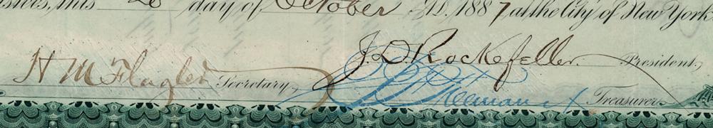 Partly-printed DS, signed “J. D. Rockefeller" and "H. M. Flagler,” one page, 11.75 x 7.75, October 20, 1887. Stock certificate for 10 shares in Rockefeller's Standard Oil Trust issued to Theodore Mallaby, signed at the conclusion by John D. Rockefeller as president, Henry M. Flagler as secretary, and Joel Francis Freeman as treasurer. In fine condition. An exceptionally nice example.