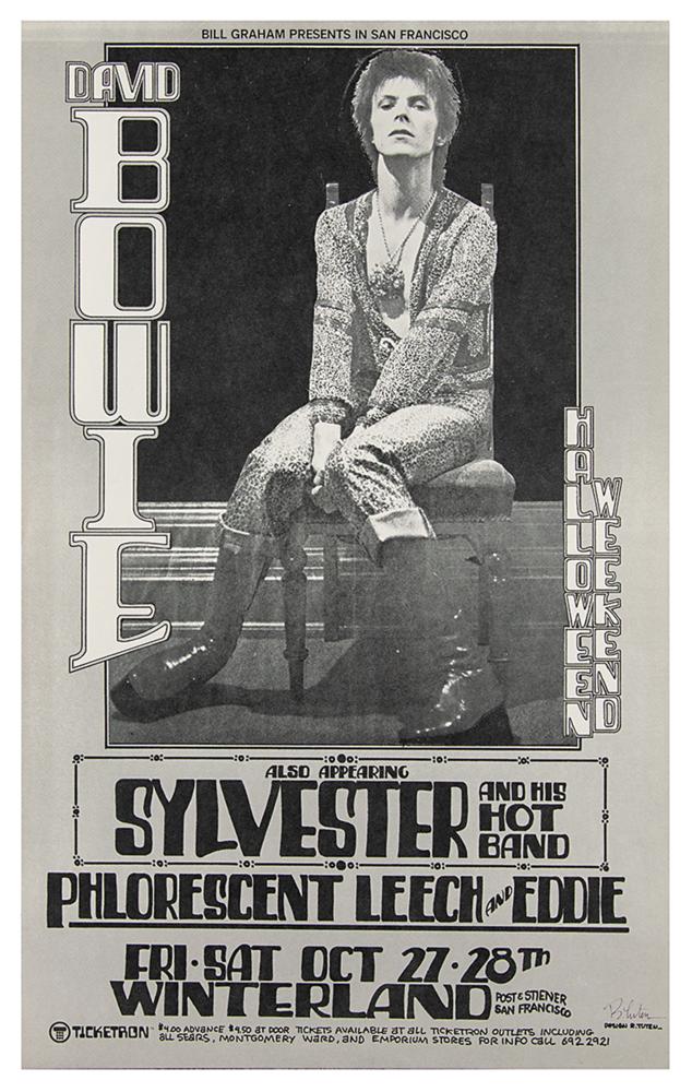 Original 13.5 x 22 poster designed by Randy Tuten for a David Bowie "Halloween Weekend," a two-concert showcase presented by Bill Graham at the Winterland Ballroom in San Francisco, California, on October 27 and 28, 1972, as part of the Ziggy Stardust Tour of 1972-1973, which marked Bowie's headlining tour of the United States. The poster, which is signed in ink in the lower right corner by Tuten, features Bowie in a full-length seated pose, and lists Sylvester and His Hot Band and Phlorescent Leech and Eddie (Flo & Eddie) as the supporting acts. In fine condition.