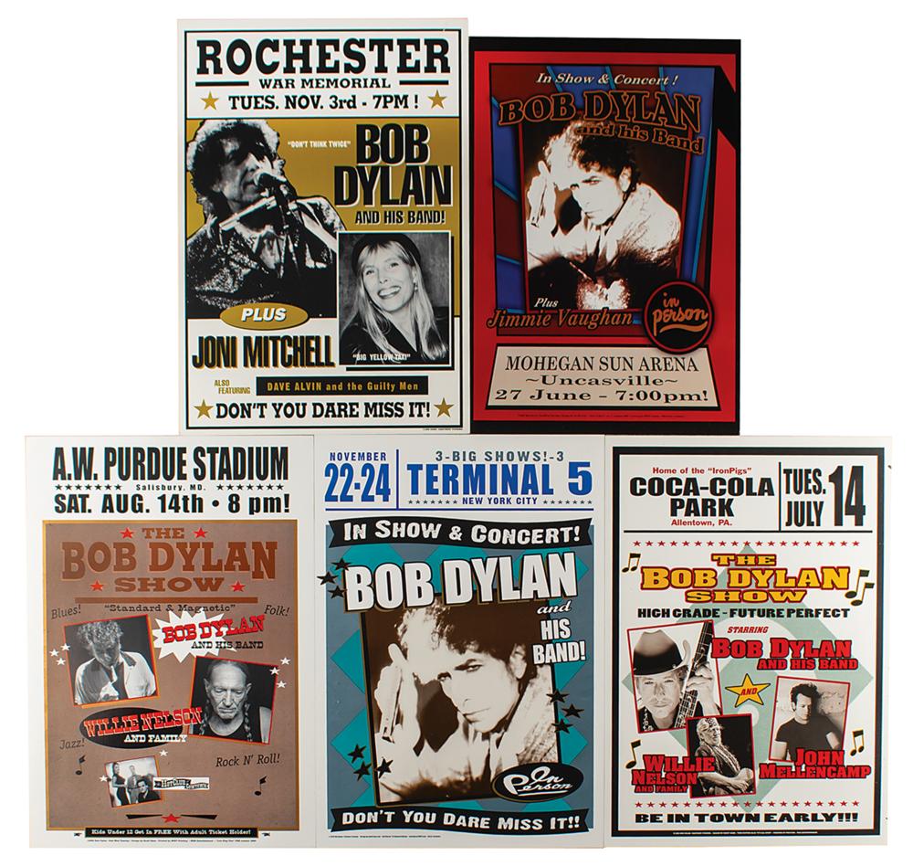 Group lot of five color posters for Bob Dylan concerts from his ongoing Never Ending Tour, four measuring 14 x 20 and one measuring 13 x 19, with the shows as follows: Blue Cross Arena (War Memorial) in Rochester, New York, on November 3, 1998 (with Joni Mitchell); Arthur W. Perdue Stadium in Salisbury, Maryland, on August 14, 2004 (with Willie Nelson); Mohegan Sun Arena at Uncasville, Connecticut, on June 27, 2007 (with Jimmie Vaughan); Coca-Cola Park in Allentown, Pennsylvania, on July 14, 2009 (with Willie Nelson and John Mellencamp); and Terminal 5 in New York City on November 22-24, 2010. In overall fine condition.