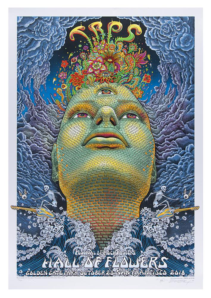 Beautiful limited edition color 22.5 x 32.5 silkscreen print for the 20th anniversary of The Rock Poster Society and its ‘Festival of Rock Posters’ held at the Hall of Flowers in San Francisco, California, on October 20, 2018, numbered 112/200, featuring stunning psychedelic artwork by rock artist Emek of a large stonework head with third eye and cosmic garden hair rising up from flowered waves with surfing skeletons and flying eyeballs into a swirling cloud vortex. Signed in the lower border in pencil by the artist, who adds a small skull sketch. Rolled and in fine condition, with a short tear to the top edge.