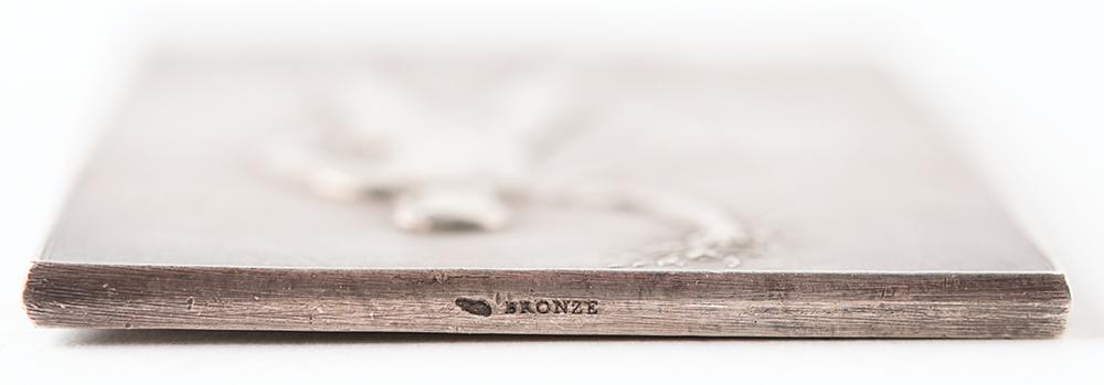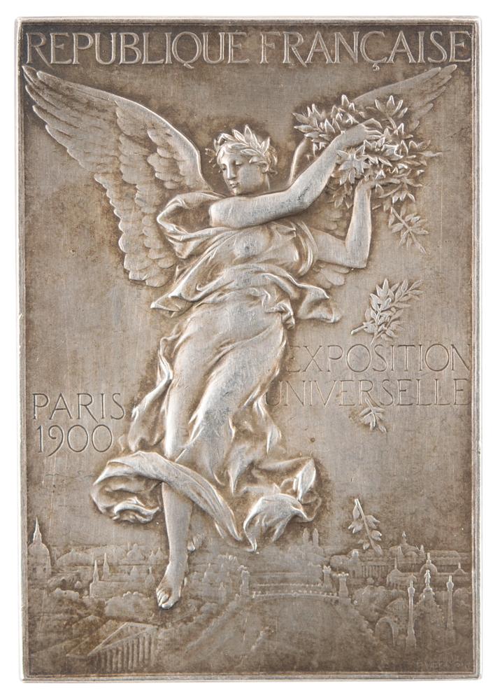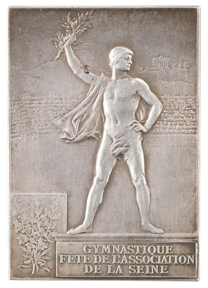 Scarce winner's medal issued for the Paris 1900 Olympics. Silvered bronze, 56 gm, 42 mm x 60 mm, by Frederic Vernon, Paris. The front, inscribed "Republique Francaise, Exposition Universelle, Paris 1900," features a winged goddess scattering laurels over the grounds of the Exposition; the reverse identifies the event as gymnastics, “Gymnastique Fete de L'association de la Seine,” and depicts a victorious athlete upon a podium. Stamped "Bronze" on the edge.