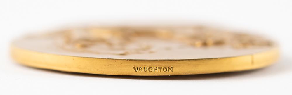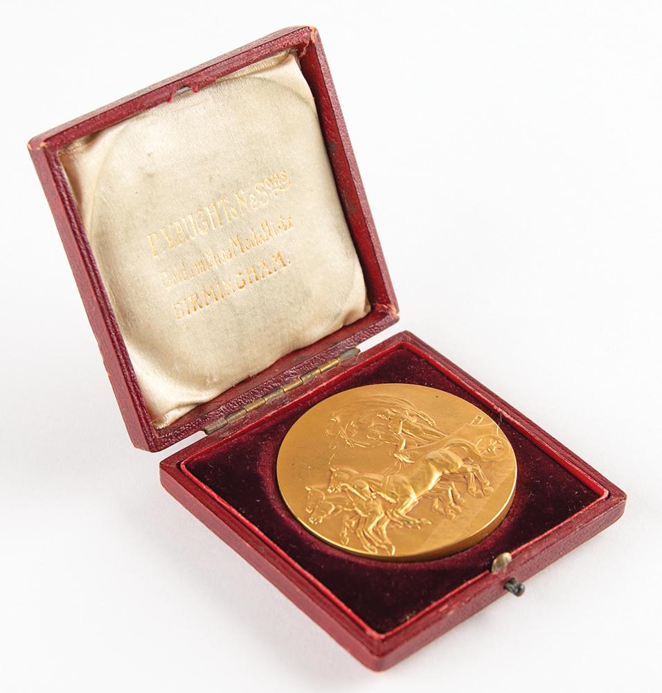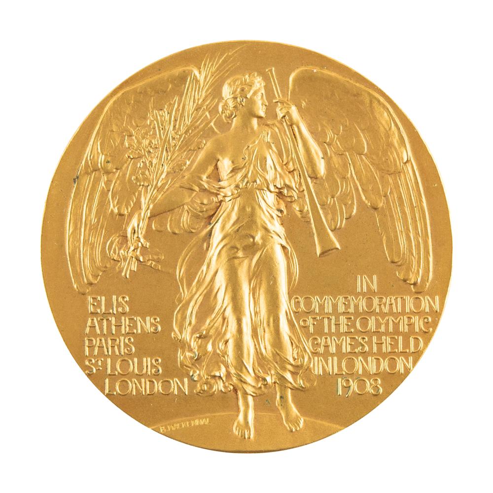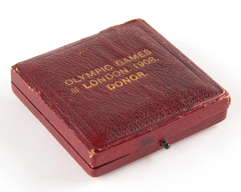 Participation medal issued for the London 1908 Olympics. Gilt bronze, 51 mm, 60 gm, by Bertram Mackennal. The front depicts a quadriga with charioteer and judge, preparing to present the palm of victory; the reverse bears the winged figure of Fame standing on a globe with raised text on either side, "Elis, Athens, Paris, St. Louis, London" and "In Commemoration of the Olympic Games Held in London, 1908." Engraved by the mint on the edge, "Vaughton." Includes its original red presentation case. Presented to dignitaries, donors, and officials, this gilt bronze medal exists as one of the most coveted of all Olympic commemoration prizes.