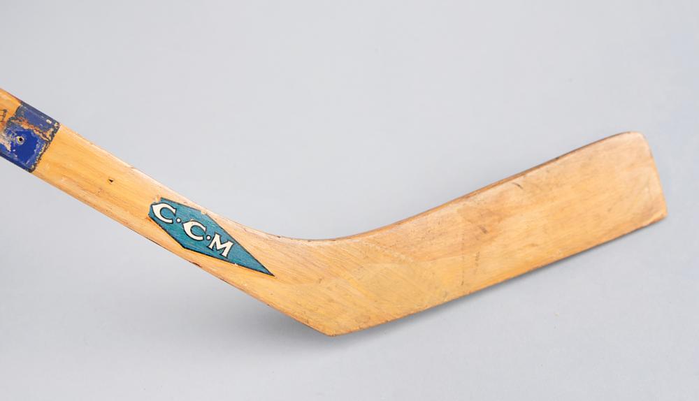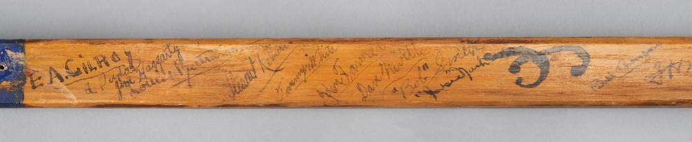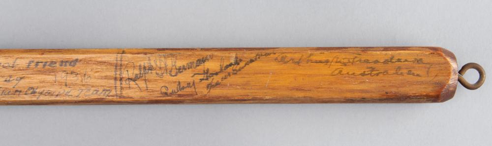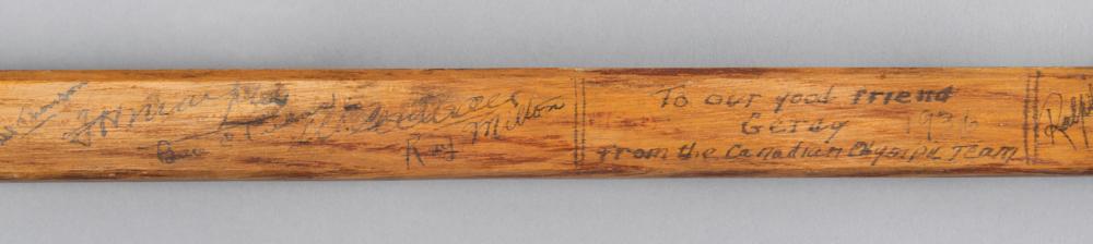 Wooden souvenir CCM hockey stick, 35″ in length, signed in ink by several members of the Canadian hockey team that won the silver medal at the Garmisch 1936 Winter Olympics, including head coach Albert Pudas, trainer Bob Smith, goalie Arthur Nash, defenseman Ray Milton, and forwards Dave Neville, Ken Farmer, Bill Thomson, Jim Haggarty, and Ralph Saint Germain. The stick is also signed by Canadian administrators E. A. Gilroy and Fred Marples, Canadian skaters Louise Bertram, Stewart Reburn, and Tommy White, and others. In fine condition.