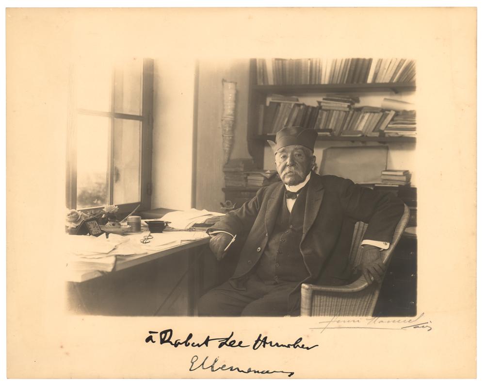 Journalist and statesman (1841-1929) who served as Prime Minister of France during World War I. Scarce matte-finish 11.5 x 9 photo of Clemenceau in his office by Henri Manuel, signed and inscribed in the lower border in fountain pen, "A Robert Lee Humber, G. Clemenceau.” Also signed in pencil by the photographer. A collector's notation on the reverse indicates that it was signed in Paris in 1929. In fine condition. Henri Marcel served as the official photographer of the French government from 1914 to 1944. Clemenceau is rarely seen in this size and format.
