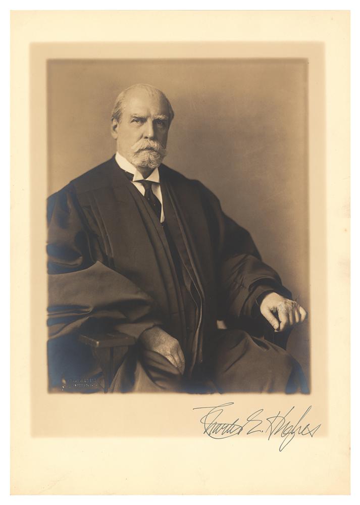 Stately matte-finish 9.25 x 13.5 portrait of Hughes in his judicial robes by Harris & Ewing, signed in fountain pen, "Charles E. Hughes." Housed in its Harris & Ewing studio folder. In fine condition, with toning and surface loss only to the original presentation folder.