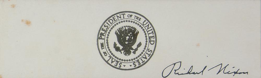 Pen used by President Richard Nixon to sign ‘An Act to provide fiscal assistance to State and local governments, to authorize Federal collection of State individual income taxes, and for other purposes’ (H. R. 14370) on October 20, 1972. The official Parker 'bill signer' pen measures 5.25″ long and features a navy-blue plastic barrel bearing a silver facsimile signature and a silver-tone cap section. Mounted and cloth-matted and framed with its original presentation box and cover, which bears a preprinted signature, a commemorative plate, and a photo of Nixon during the signing to an overall size of 19.75 x 19.75. In fine condition, with noticeable wear to the frame.