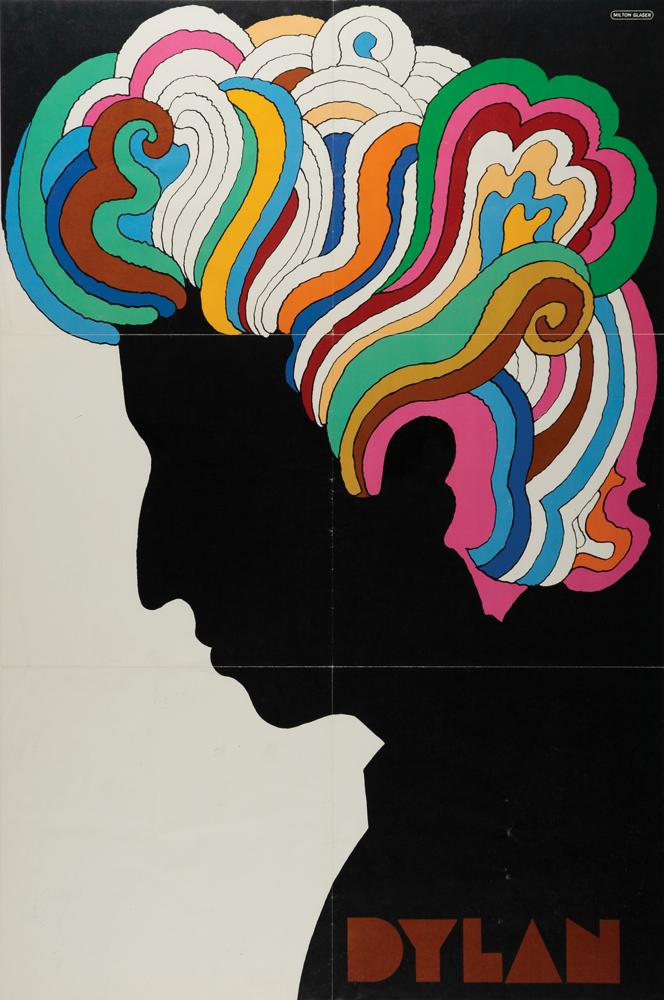 Classic original color 22 x 33 poster of Bob Dylan designed by Milton Glaser, issued in Dylan's first Greatest Hits album, showing the famed troubadour in silhouette profile with colorful swirls in his hair. In fine condition, with some light creasing, and intersecting folds as issued. An iconic piece of rock 'n' roll artwork.
