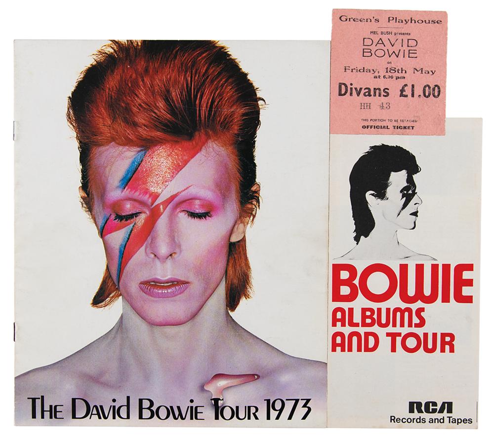 Three pieces of ephemera from David Bowie's 1973 Ziggy Stardust Tour: a very worn pink ticket stub from his show at Green's Playhouse in Glasgow, Scotland, on May 18, 1973; an original eight-page program from "The David Bowie Tour 1973"; and an RCA Records and Tapes "Bowie Albums and Tour" brochure from 1973, with a list of tour dates and RCA albums. In very good to fine condition, with overall creasing to both the ticket and the program.