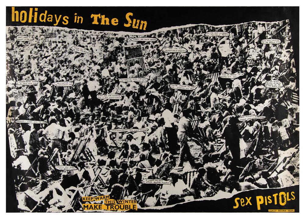 Original color 39.25 x 27.5 Virgin Records promotional poster designed by Jamie Reid for the Sex Pistols' 1977 single 'Holidays in the Sun,' which features a monochrome image of a packed beach scene with an assortment of speech bubbles containing the song's lyrics: "I don't want a holiday in the sun / I wanna go to the new Belsen / I wanna see some history / cos now I've got a reasonable economy." Text to lower section reads: "Keep warm this winter, make trouble." In fine condition. A classic punk poster from the groundbreaking group.