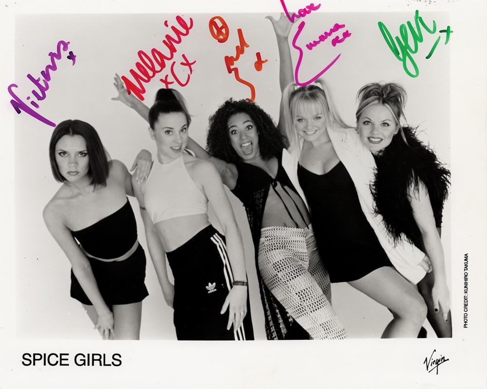 Satin-finish 10 x 8 Virgin Records publicity photo of the Spice Girls, signed in various inks by Victoria Beckham, Melanie Chisholm, Melanie Brown, Geri Halliwell, and Emma Bunton, all signing with first names only. In fine condition, with a few small surface creases.
