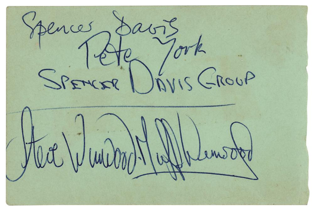 Vintage ballpoint signatures of Spencer Davis, Steve Winwood, Muff Winwood, and Peter York, who adds "Spencer Davis Group," on a light green 4.75 x 3 album page. In fine condition.
