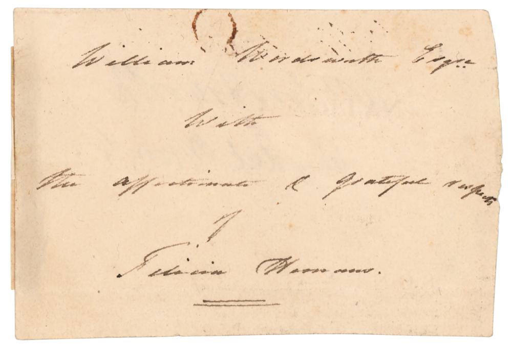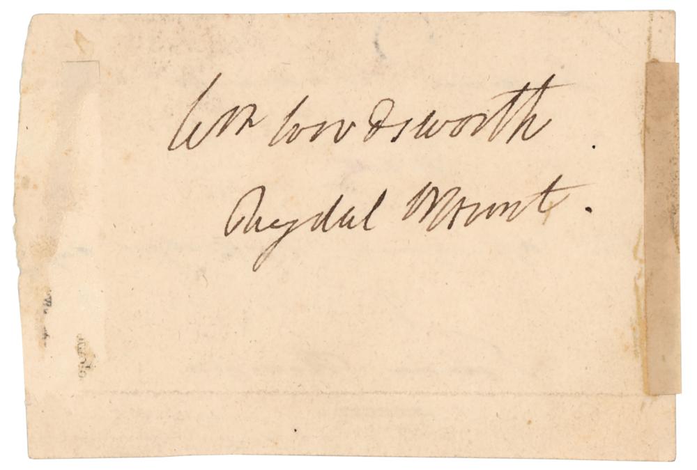 Rare pairing of ink signatures, "Wm. Wordsworth, Rydal Mount" and "William Wordsworth, Esq're, with the affectionate regards of Felicia Hemans,” on opposite sides of an off-white 4 x 2.75 slip. In fine condition, with a rusty circular paperclip impression to the top and mounting remnants to edges.