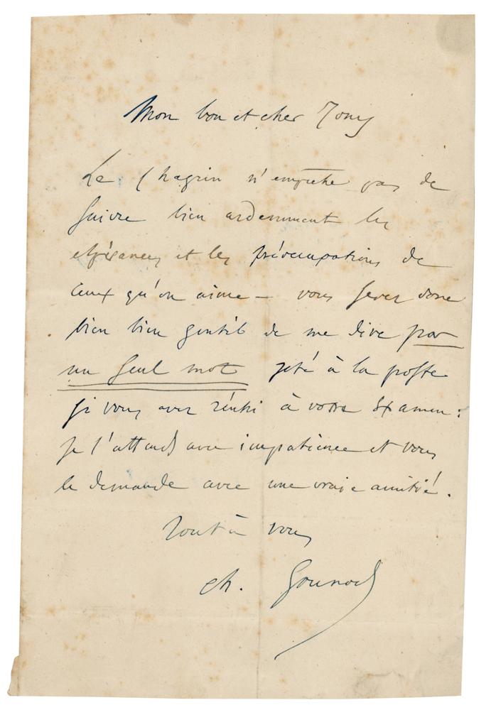 French composer (1818-1893) best remembered for his composition of 'Ave Maria.' ALS in French, signed “Ch. Gounod,” one page, 5 x 7.5, no date. Untranslated handwritten letter to Monsieur Tony Fleury. In very good condition, with light overall foxing and some discoloration to the ink.