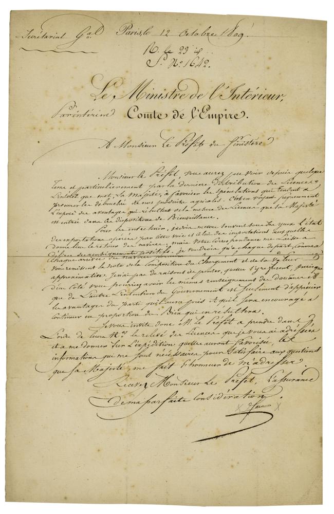 French statesman (1759-1820) who famously served as Minister of Police under Napoleon. Manuscript DS in French, signed “Fouche,” one page, 8 x 12.25, October 12, 1809. Untranslated document signed by Fouche as Minister of the Interior. In fine condition, with light foxing.