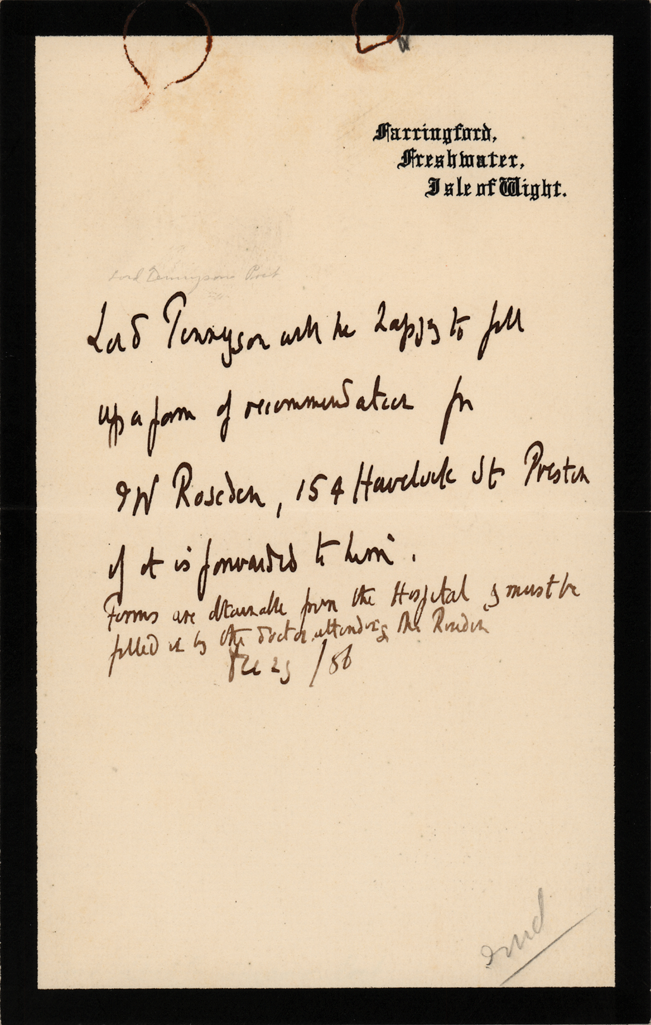 Third-person ALS, signed within the text, “Lord Tennyson,” one page, 4.5 x 7, black-bordered Farringford letterhead, 1886. Handwritten letter by the celebrated poet, in part: "Lord Tennyson will be happy to fill up a form of recommendation for J. W. Roseden, 154 Havelock St., Preston, if it is forwarded to him." In fine condition, with two rusty circular paperclip impressions to the top.
