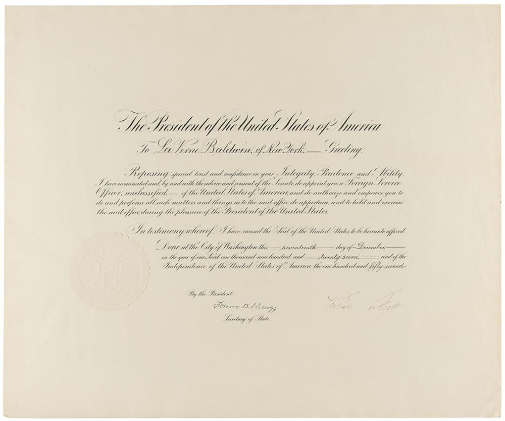 Partly-printed DS as president, one page, 23 x 19, December 17, 1927. President Coolidge appoints LaVerne Baldwin of New York as "a Foreign Service Officer, unclassified, of the United States of America." Crisply signed at the conclusion by President Coolidge and countersigned by Secretary of State Frank B. Kellogg. The embossed white paper seal affixed to the lower left remains intact. In fine condition, with creasing to the lower right corner.
