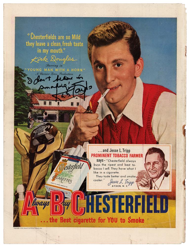 Vintage circa 1950 magazine advertisement for Chesterfield Cigarettes, 10.5 x 14, which depicts a young Kirk Douglas about to light a cigarette on the golf course, signed in black felt tip, “I don’t believe in smoking! Kirk Douglas.” Text to the left side quotes Douglas as saying, “‘Chesterfields are so Mild they leave a clean, fresh taste in my mouth,’” and then promotes his role in the Warner Bros. film Young Man with a Horn. In fine condition, with wear to edges.
