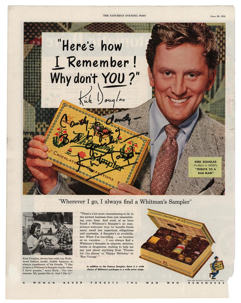 Vintage magazine advertisement removed from the June 28, 1952 issue of the Saturday Evening Post, 10.5 x 13.5, which depicts a young Kirk Douglas smiling and holding a Whitman’s Sampler ‘Chocolate & Confections’ box, signed in black felt tip, “Candy is dandy—But liquor is quicker—Kirk Douglas.” Text above quotes Douglas as saying, “‘Here’s how I remember! Why don’t you?,’” and a small box to the lower right promotes his role in the MGM film Tribute to a Bad Man. In fine condition, with wear to edges.
