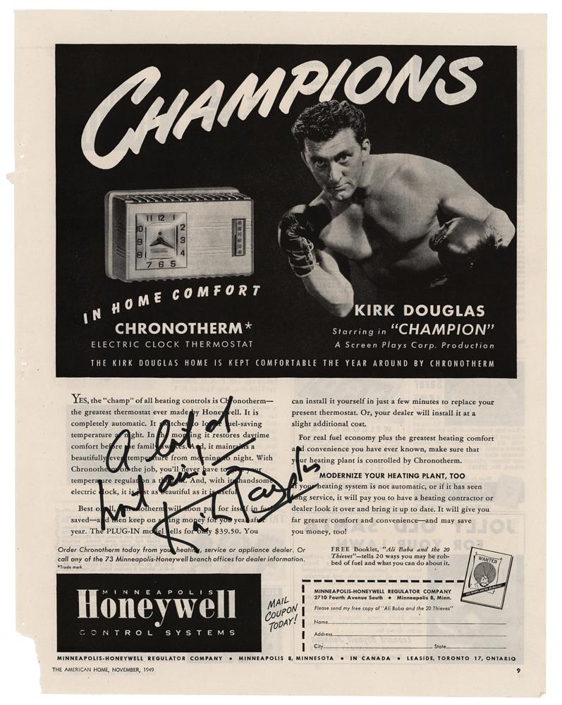 Vintage magazine advertisement removed from the November 1949 issue of The American Home, 9.75 x 12.5, which depicts a young Kirk Douglas in a half-length boxing pose next to a Chronotherm electric clock thermostat by Honeywell, signed in black felt tip, “A lot of hot air!—Kirk Douglas.” Text below states that Douglas is starring in the Screen Plays Corps film Champion and that “The Kirk Douglas home is kept comfortable the year round by Chronotherm.” In fine condition, with wear to edges.