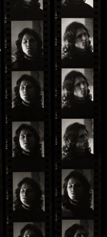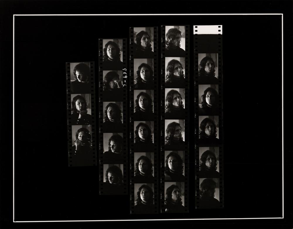 Great original glossy 14 x 11 silver gelatin contact sheet print with 25 images of The Doors frontman Jim Morrison taken by Linda McCartney, featuring a sequence of close-ups poses. Stamped on the reverse by Star File and annotated with Linda McCartney's credit. In fine condition.