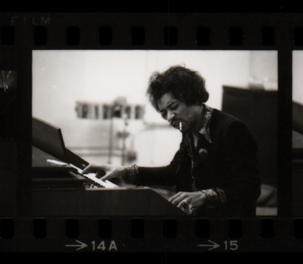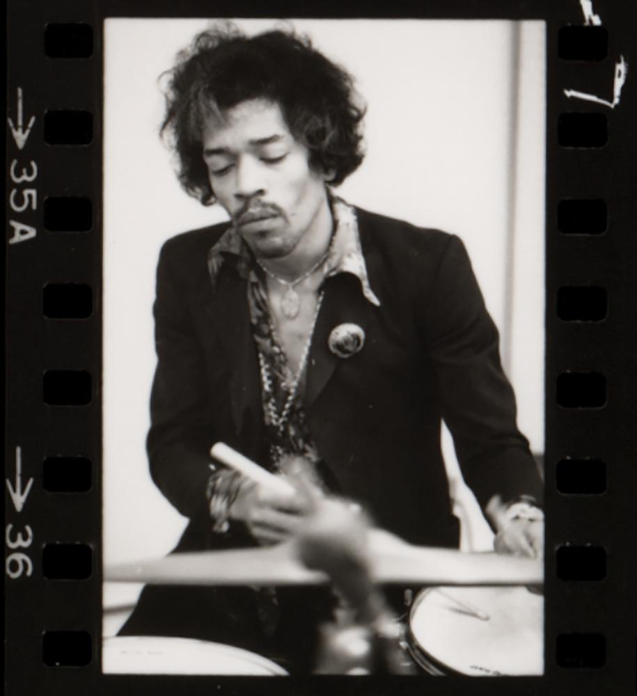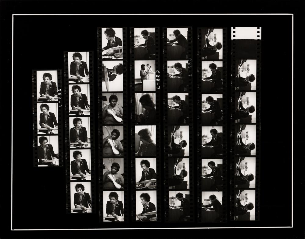 Fantastic original glossy 14 x 11 silver gelatin contact sheet print with 37 images of Jimi Hendrix, Buddy Miles, and Mitch Mitchell taken by Linda McCartney, showing them during a playful role-switching jam session: Hendrix plays the drums and keyboard, while Miles takes up Jimi's famous white upside-down Stratocaster. Hendrix appears in 31 of the photographs. Reverse is blank. In fine condition.
