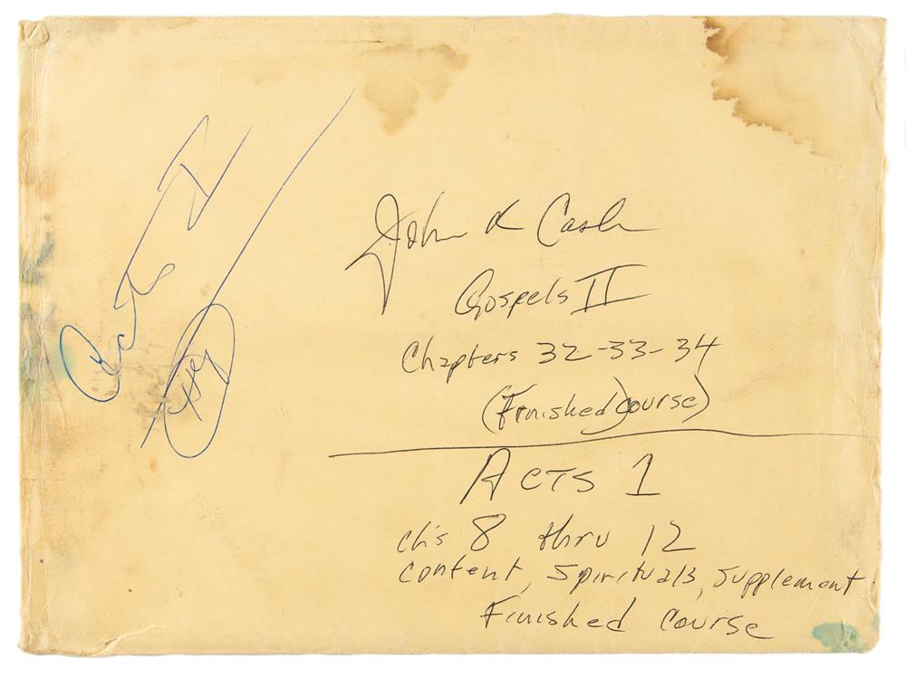 Unusual 12 x 9 manila envelope evidently used by Johnny Cash for Bible study coursework, annotated and signed in ballpoint, "John R. Cash, Gospels II, Chapters 32-33-34, (Finished Course) / Acts 1, Ch's 8 thru 12, content, spirituals, supplement, Finished Course." In very good condition, with staining and creasing from heavy use.