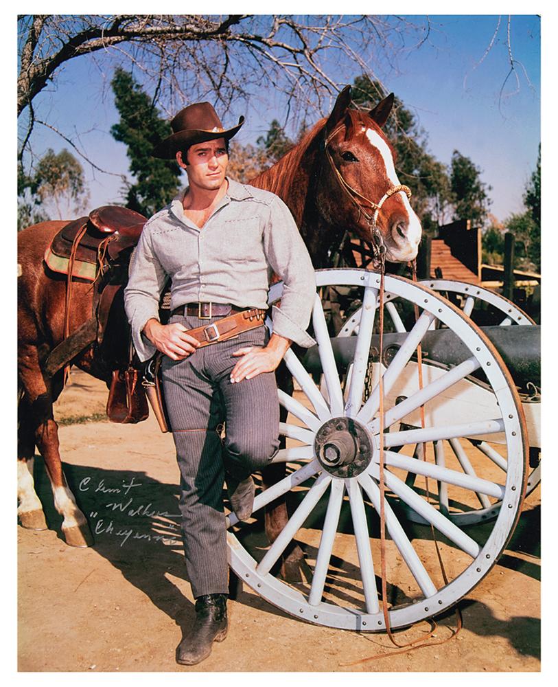 Color glossy 16 x 20 photo of burly Clint Walker as cowboy Cheyenne Bodie in the western series Cheyenne, signed in silver ink, "Clint Walker, 'Cheyenne.'" In very fine condition.