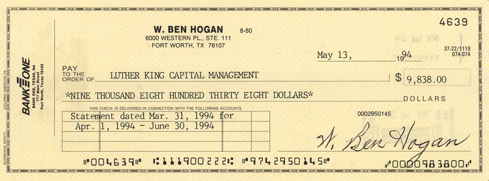 Personal check, 8.25 x 3, filled out in type and signed by Ben Hogan, "W. Ben Hogan," payable to Luther King Capital Management for $9,838, May 13, 1994. In fine condition.