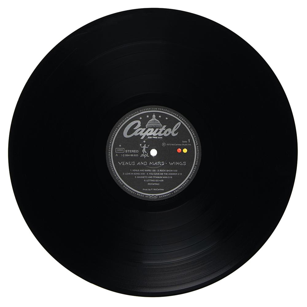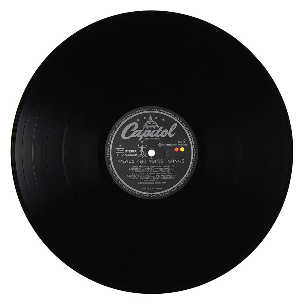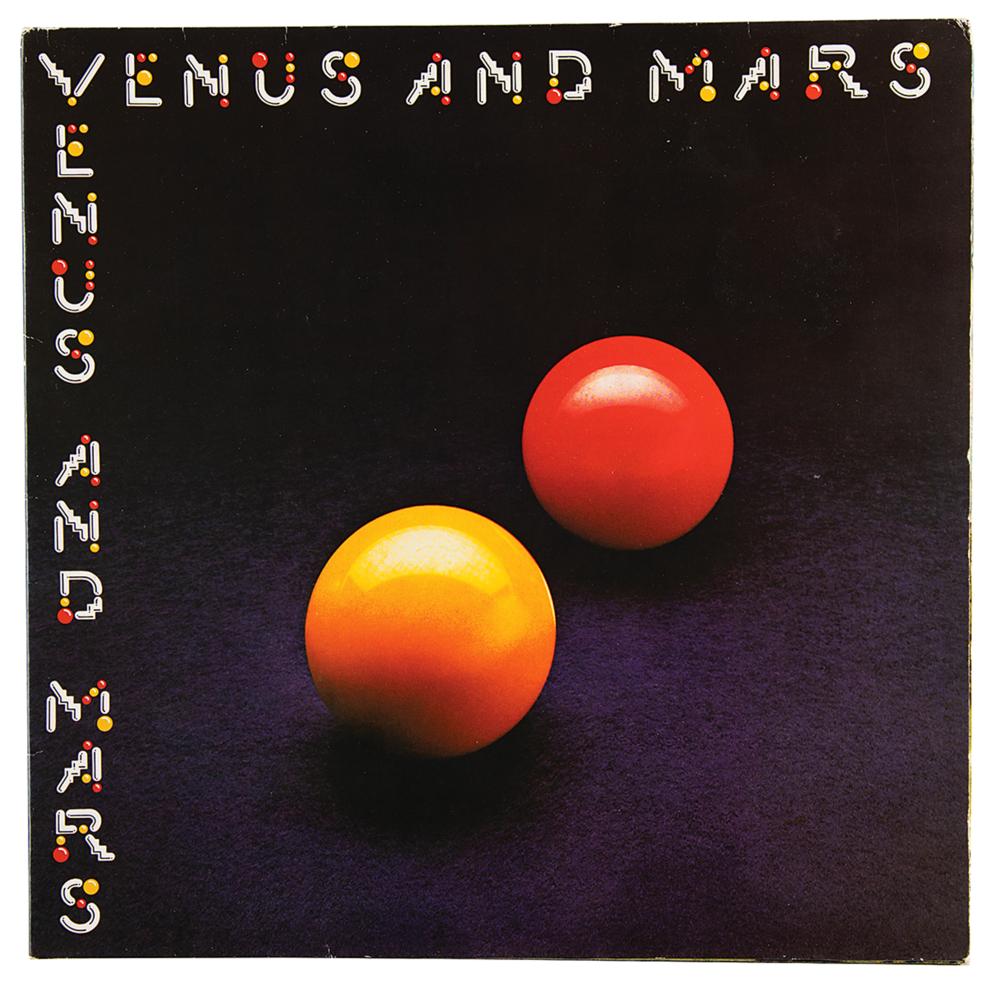 German vinyl pressing of the 1975 Paul McCartney and Wings album Venus and Mars, signed on the inner gatefold in blue ballpoint, “Paul McCartney,” and in blue felt tip, “To Robert, Linda McCartney” and “Hi Robert, Denny Laine.” Consignor notes that the autographs of Paul and Linda were obtained outside Paul’s MPL London offices in 1987, and the Laine signature was obtained in Holland in 1988. In fine condition. The record is included.