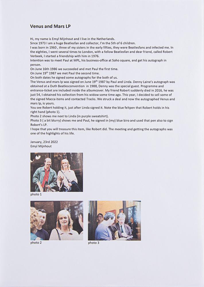 Accompanied by a certificate of authenticity from Tracks, a ticket and a program for a 1989 Beatles convention in Amsterdam, and a letter of provenance from a friend of the original recipient, which features three images of photographs taken at the time of the Paul and Linda signings. The letter, in part: “Since 1973 I am a huge Beatles fan and collector…In the eighties, I went several times to London, with a fellow Beatles fan and dear friend, called Robert Verbeek…Intention was to meet Paul at MPL, his business-office at Soho square, and get his autograph in person. On June 16th 1986 we succeeded and met Paul the first time. On June 19th 1987 we met Paul the second time. On both dates he signed some autographs for the both of us. The Venus and Mars LP was signed on June 19th 1987 by Paul and Linda. Denny Laine’s autograph was obtained at a Dutch Beatles convention in 1988. Programme and entrance-ticket are included inside the album cover.”