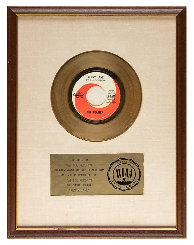 Ultra-desirable official white-matte RIAA gold record sales award “Presented to Capitol Records to commemorate the sale of more than one million copies of the Capitol Records pop single record ‘Penny Lane.'" Framed with its gold disc and plate to an overall size of 13.25 x 17.25; the award appears to be rebacked and bears a replica of the New York Frame & Picture label. In fine condition, with some foxing to the bottom of the mat.